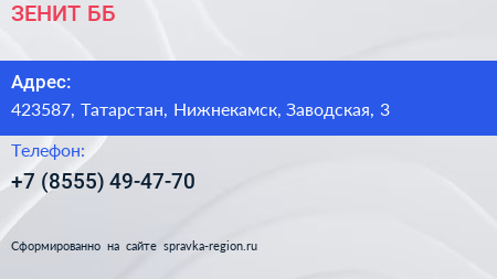 ЗЕНИТ-ББ по адресу 423587, Татарстан, Нижнекамск, Заводская, 3 в дальнейшем Организация, размещена в следующих категориях: