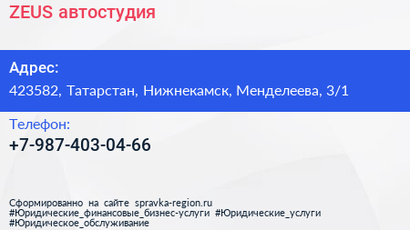 ZEUS, автостудия по адресу 423582, Татарстан, Нижнекамск, Менделеева, 3/1 в дальнейшем Организация, размещена в следующих категориях: