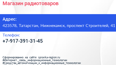 Магазин радиотоваров по адресу 423578, Татарстан, Нижнекамск, проспект Строителей, 41 в дальнейшем Организация, размещена в следующих категориях: