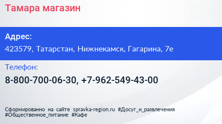 Тамара, магазин по адресу 423579, Татарстан, Нижнекамск, Гагарина, 7е в дальнейшем Организация, размещена в следующих категориях: