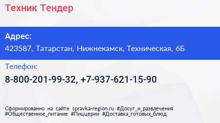 Техник Тендер по адресу 423587, Татарстан, Нижнекамск, Техническая, 6Б в дальнейшем Организация, размещена в следующих категориях: