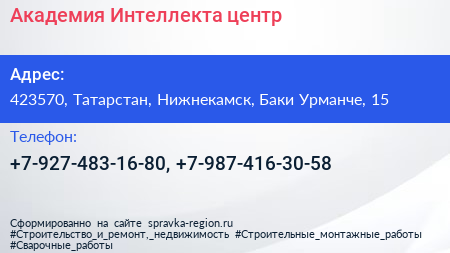 Академия Интеллекта, центр по адресу 423570, Татарстан, Нижнекамск, Баки Урманче, 15 в дальнейшем Организация, размещена в следующих категориях: