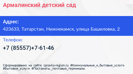 Армалинский детский сад по адресу 423633, Татарстан, Нижнекамск, улица Башиловка, 2 в дальнейшем Организация, размещена в следующих категориях: