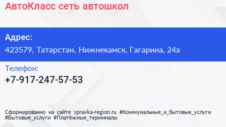 АвтоКласс, сеть автошкол по адресу 423579, Татарстан, Нижнекамск, Гагарина, 24а в дальнейшем Организация, размещена в следующих категориях: