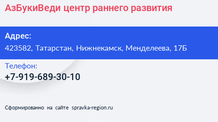 АзБукиВеди, центр раннего развития по адресу 423582, Татарстан, Нижнекамск, Менделеева, 17Б в дальнейшем Организация, размещена в следующих категориях: