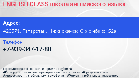 ENGLISH CLASS, школа английского языка по адресу 423571, Татарстан, Нижнекамск, Сююмбике, 52а в дальнейшем Организация, размещена в следующих категориях: