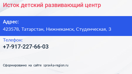 Исток, детский развивающий центр по адресу 423578, Татарстан, Нижнекамск, Студенческая, 3 в дальнейшем Организация, размещена в следующих категориях: