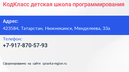 КодКласс, детская школа программирования по адресу 423584, Татарстан, Нижнекамск, Менделеева, 33а в дальнейшем Организация, размещена в следующих категориях: