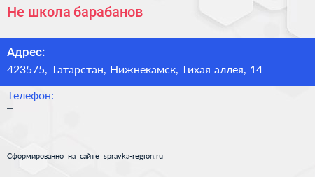 Не школа барабанов по адресу 423575, Татарстан, Нижнекамск, Тихая аллея, 14 в дальнейшем Организация, размещена в следующих категориях: