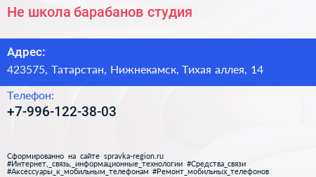 Не школа барабанов, студия по адресу 423575, Татарстан, Нижнекамск, Тихая аллея, 14 в дальнейшем Организация, размещена в следующих категориях: