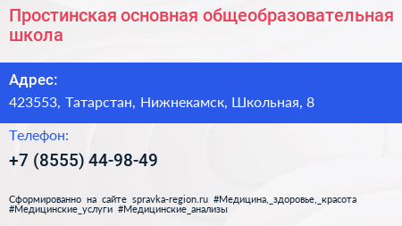 Простинская основная общеобразовательная школа по адресу 423553, Татарстан, Нижнекамск, Школьная, 8 в дальнейшем Организация, размещена в следующих категориях: