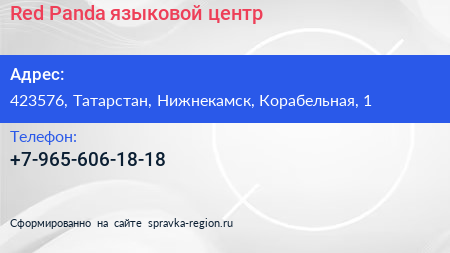 Red Panda, языковой центр по адресу 423576, Татарстан, Нижнекамск, Корабельная, 1 в дальнейшем Организация, размещена в следующих категориях:
