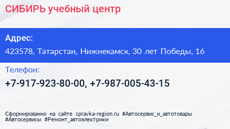 СИБИРЬ, учебный центр по адресу 423578, Татарстан, Нижнекамск, 30 лет Победы, 16 в дальнейшем Организация, размещена в следующих категориях: