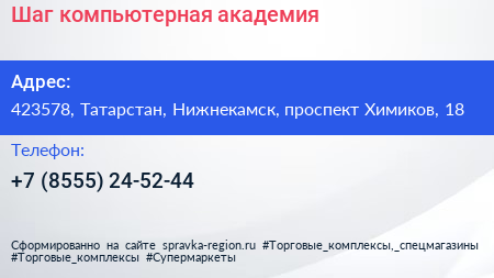 Шаг, компьютерная академия по адресу 423578, Татарстан, Нижнекамск, проспект Химиков, 18 в дальнейшем Организация, размещена в следующих категориях: