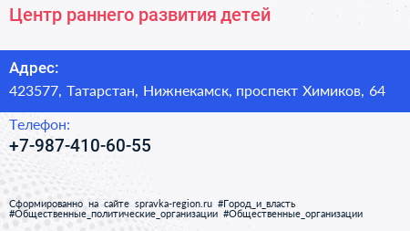Центр раннего развития детей по адресу 423577, Татарстан, Нижнекамск, проспект Химиков, 64 в дальнейшем Организация, размещена в следующих категориях: