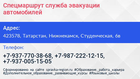Спецмаршрут, служба эвакуации автомобилей по адресу 423578, Татарстан, Нижнекамск, Студенческая, 6в в дальнейшем Организация, размещена в следующих категориях: