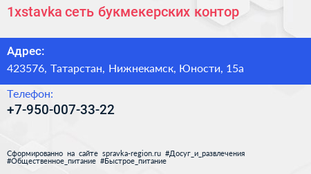1xstavka, сеть букмекерских контор по адресу 423576, Татарстан, Нижнекамск, Юности, 15а в дальнейшем Организация, размещена в следующих категориях: