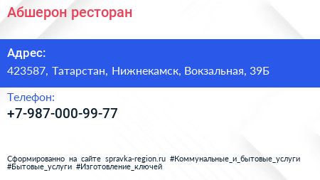Абшерон, ресторан по адресу 423587, Татарстан, Нижнекамск, Вокзальная, 39Б в дальнейшем Организация, размещена в следующих категориях:
