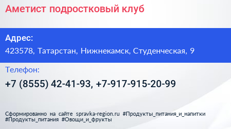 Аметист, подростковый клуб по адресу 423578, Татарстан, Нижнекамск, Студенческая, 9 в дальнейшем Организация, размещена в следующих категориях: