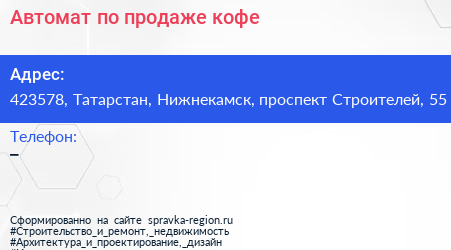 Автомат по продаже кофе по адресу 423578, Татарстан, Нижнекамск, проспект Строителей, 55 в дальнейшем Организация, размещена в следующих категориях: