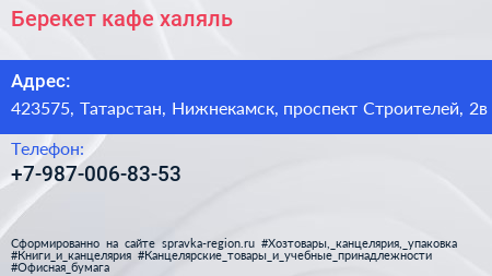 Берекет, кафе халяль по адресу 423575, Татарстан, Нижнекамск, проспект Строителей, 2в в дальнейшем Организация, размещена в следующих категориях: