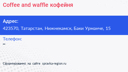 Coffee and waffle, кофейня по адресу 423570, Татарстан, Нижнекамск, Баки Урманче, 15 в дальнейшем Организация, размещена в следующих категориях: