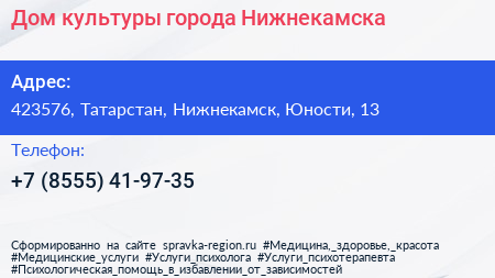 Дом культуры города Нижнекамска по адресу 423576, Татарстан, Нижнекамск, Юности, 13 в дальнейшем Организация, размещена в следующих категориях: