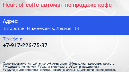 Heart of coffe, автомат по продаже кофе по адресу Татарстан, Нижнекамск, Лесная, 14 в дальнейшем Организация, размещена в следующих категориях: