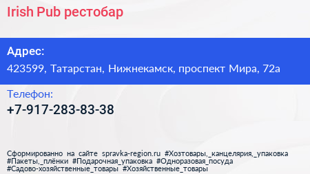 Irish Pub, рестобар по адресу 423599, Татарстан, Нижнекамск, проспект Мира, 72а в дальнейшем Организация, размещена в следующих категориях: