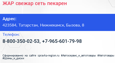 ЖАР свежар, сеть пекарен по адресу 423584, Татарстан, Нижнекамск, Бызова, 8 в дальнейшем Организация, размещена в следующих категориях: