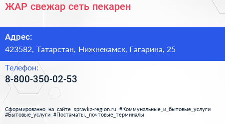 ЖАР свежар, сеть пекарен по адресу 423582, Татарстан, Нижнекамск, Гагарина, 25 в дальнейшем Организация, размещена в следующих категориях: