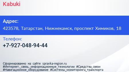 Kabuki по адресу 423578, Татарстан, Нижнекамск, проспект Химиков, 18 в дальнейшем Организация, размещена в следующих категориях: