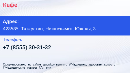Кафе по адресу 423585, Татарстан, Нижнекамск, Южная, 3 в дальнейшем Организация, размещена в следующих категориях: