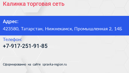 Калинка, торговая сеть по адресу 423580, Татарстан, Нижнекамск, Промышленная 2, 14Б в дальнейшем Организация, размещена в следующих категориях: