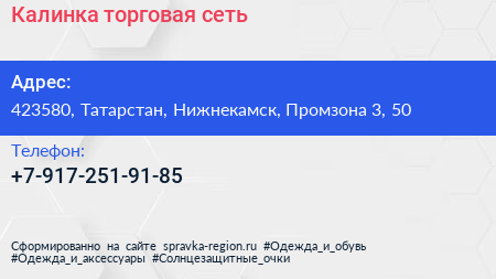 Калинка, торговая сеть по адресу 423580, Татарстан, Нижнекамск, Промзона 3, 50 в дальнейшем Организация, размещена в следующих категориях:
