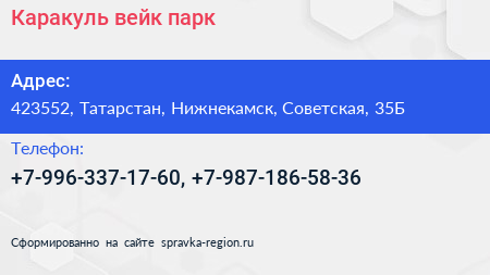 Каракуль, вейк-парк по адресу 423552, Татарстан, Нижнекамск, Советская, 35Б в дальнейшем Организация, размещена в следующих категориях: