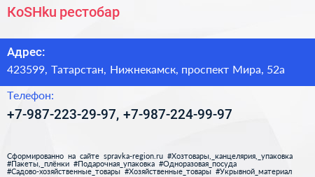 КоSHku, рестобар по адресу 423599, Татарстан, Нижнекамск, проспект Мира, 52а в дальнейшем Организация, размещена в следующих категориях: