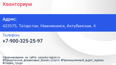 Кванториум по адресу 423575, Татарстан, Нижнекамск, Ахтубинская, 4 в дальнейшем Организация, размещена в следующих категориях: