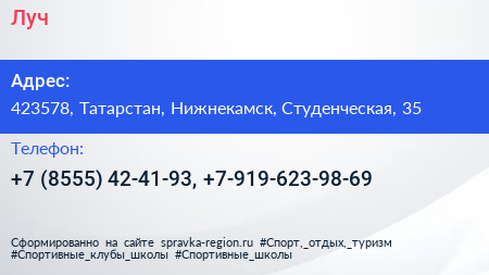 Луч по адресу 423578, Татарстан, Нижнекамск, Студенческая, 35 в дальнейшем Организация, размещена в следующих категориях: