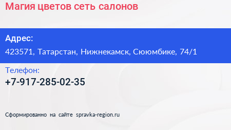 Магия цветов, сеть салонов по адресу 423571, Татарстан, Нижнекамск, Сююмбике, 74/1 в дальнейшем Организация, размещена в следующих категориях: