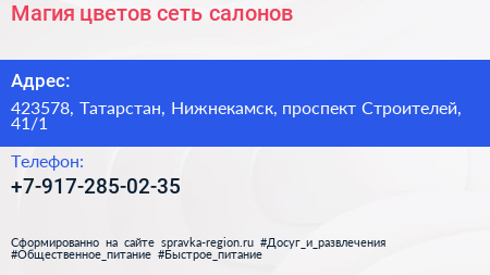 Магия цветов, сеть салонов по адресу 423578, Татарстан, Нижнекамск, проспект Строителей, 41/1 в дальнейшем Организация, размещена в следующих категориях: