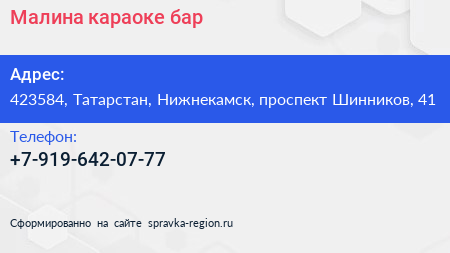 Малина, караоке-бар по адресу 423584, Татарстан, Нижнекамск, проспект Шинников, 41 в дальнейшем Организация, размещена в следующих категориях: