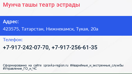 Мунча ташы, театр эстрады по адресу 423575, Татарстан, Нижнекамск, Тукая, 20а в дальнейшем Организация, размещена в следующих категориях: