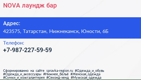 NOVA, лаундж-бар по адресу 423575, Татарстан, Нижнекамск, Юности, 6Б в дальнейшем Организация, размещена в следующих категориях: