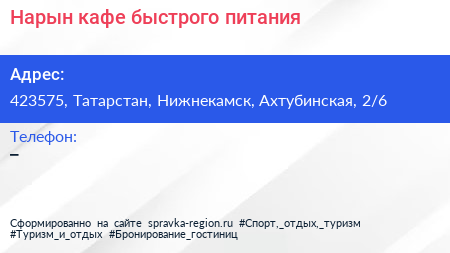 Нарын, кафе быстрого питания по адресу 423575, Татарстан, Нижнекамск, Ахтубинская, 2/6 в дальнейшем Организация, размещена в следующих категориях: