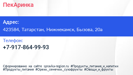 ПекАринка по адресу 423584, Татарстан, Нижнекамск, Бызова, 20а в дальнейшем Организация, размещена в следующих категориях: