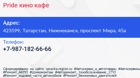 Pride, кино-кафе по адресу 423599, Татарстан, Нижнекамск, проспект Мира, 45а в дальнейшем Организация, размещена в следующих категориях: