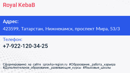 Royal KebaB по адресу 423599, Татарстан, Нижнекамск, проспект Мира, 53/3 в дальнейшем Организация, размещена в следующих категориях: