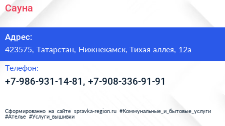 Сауна по адресу 423575, Татарстан, Нижнекамск, Тихая аллея, 12а в дальнейшем Организация, размещена в следующих категориях: