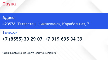 Сауна по адресу 423576, Татарстан, Нижнекамск, Корабельная, 7 в дальнейшем Организация, размещена в следующих категориях: